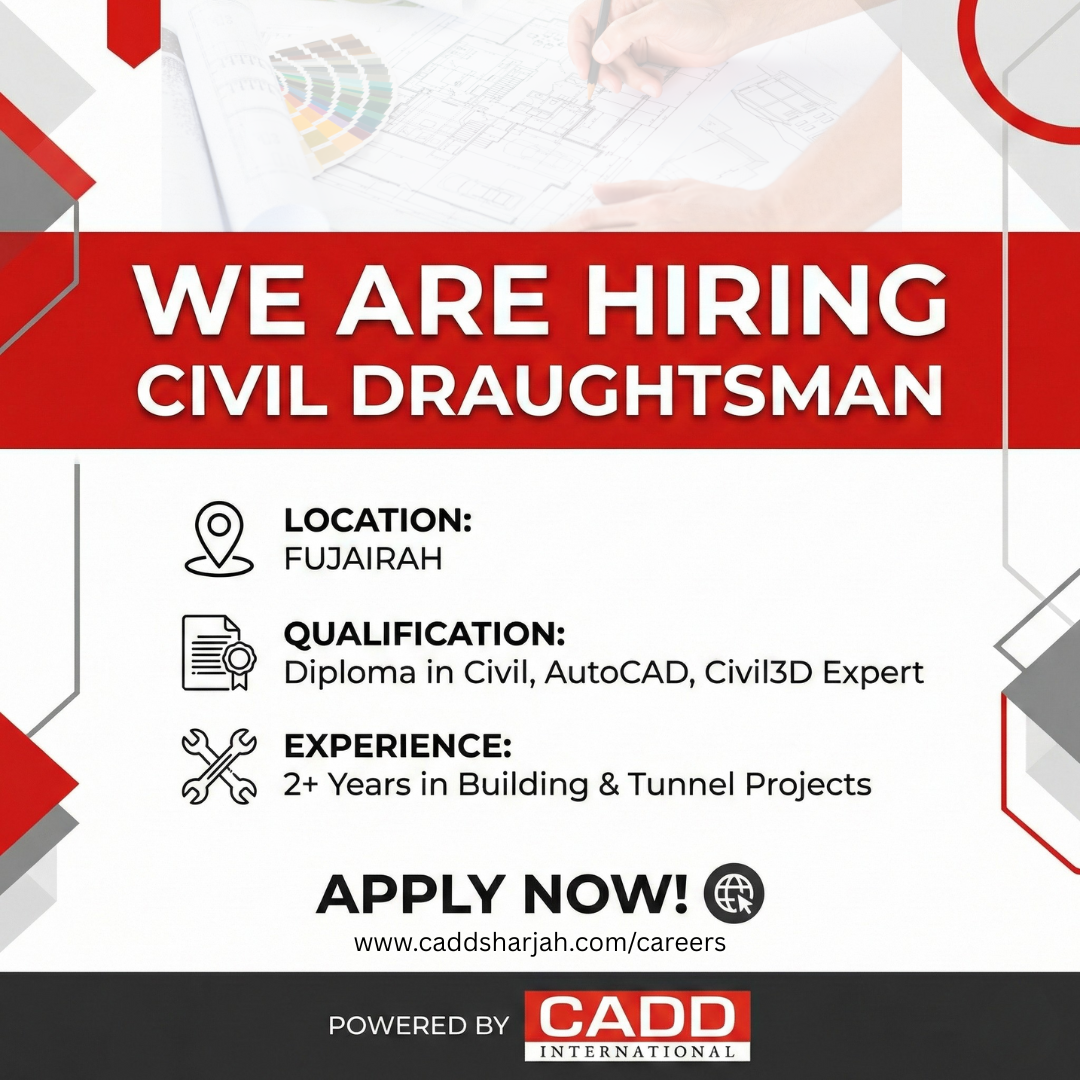 #Hiring #JobsUAE #FujairahJobs #CivilEngineering #Draughtsman #AutoCAD #Civil3D #TunnelProjects #ConstructionJobs #CADDInternational #Sharjah #UAEJobs
