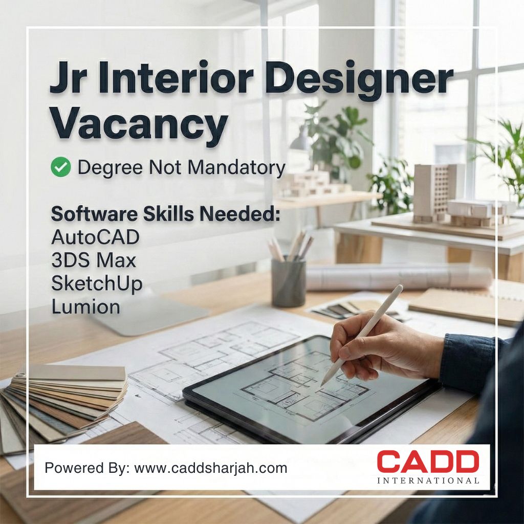 #InteriorDesignJobs #SharjahJobs #HiringUAE #JuniorInteriorDesigner #AutoCADJobs #3dsMax #SketchUp #Lumion #JobsInSharjah #UAEHiring #CADDSharjah #DesignCareers